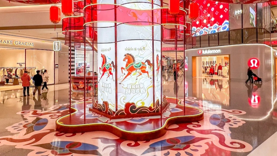 围绕“真如功德 跃马迎春”新春主题,中海真如环宇城MAX市场特地呈现“跃马迎春”主题艺术好意思陈。市场中庭宫灯高度约8米,摄取多层镂空工艺搭建,灯体主视觉撷取壁画飞天、祥云经典纹样,搭配鎏金、朱红、暖橙传统色系,尽显典雅大气。灯体四面绘有灵动跃马图案,满身悬垂数十盏细巧小红灯,与顶部延展的红色绸带交相照映,灯影摇曳、绸带翩飞,开云体育新春氛围感迷漫。好意思陈底部铺设呼应纹样的祥云地贴,自宫灯基座向四周铺展,酿成“祥云托灯”的视觉成果,与市场挑高空间瑕瑜分明、田地迷漫。