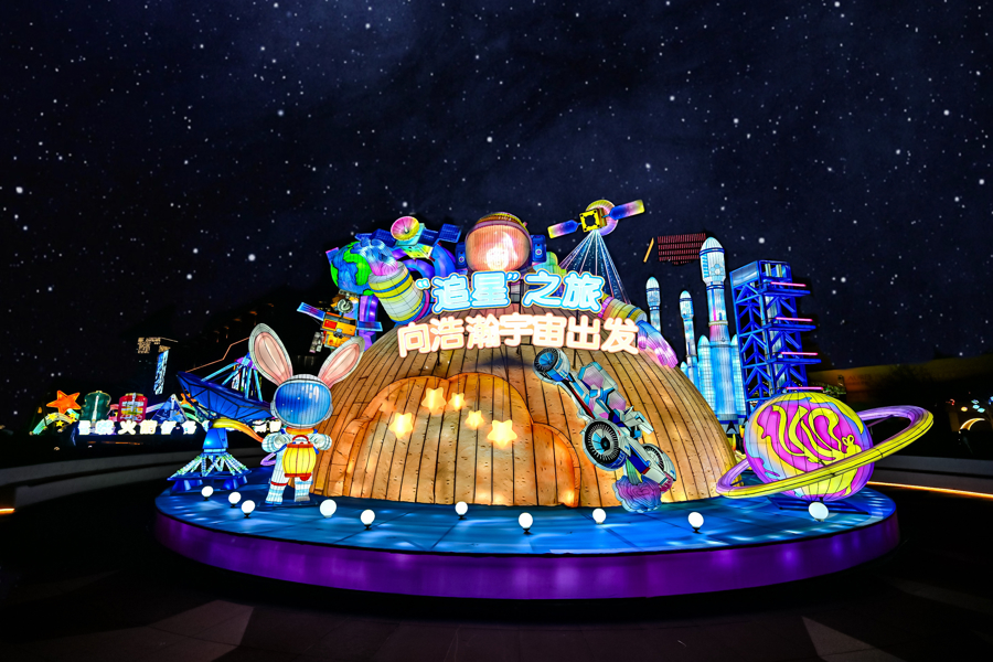 本届灯会极端树立航上帝题灯区,选址仲盛全国商城南广场,将闵行深厚的航天文化积淀与新春愿景相交融。灯组以“银河映征途,莘年王人坦途”为筹划干线,既寄寓对新年征途的好意思好祝愿,也为亲子家庭与航天嗜好者打造了一处可互动、可体验的“明天空间”。