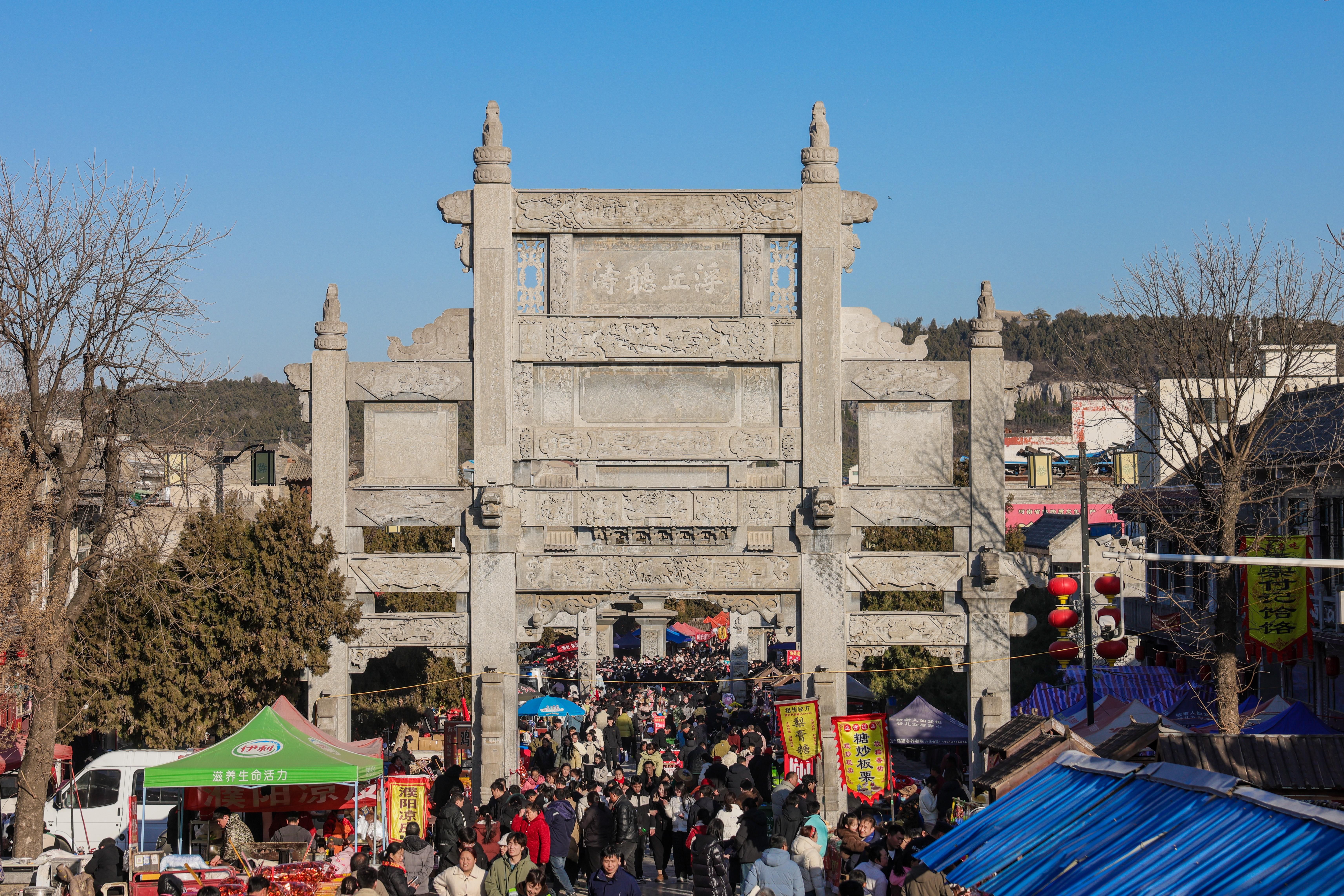 从古城墙到山门的长街上,密布着3000多个摊位:手工铸造的浚县门钹铿锵作响,淮阳泥泥狗与浚县泥咕咕隔空对话,而“子馍”小贩将鲜肉、蛋液灌入鹅卵石烤热的饼坯,升腾的香气裹带着千年的贩子焰火。