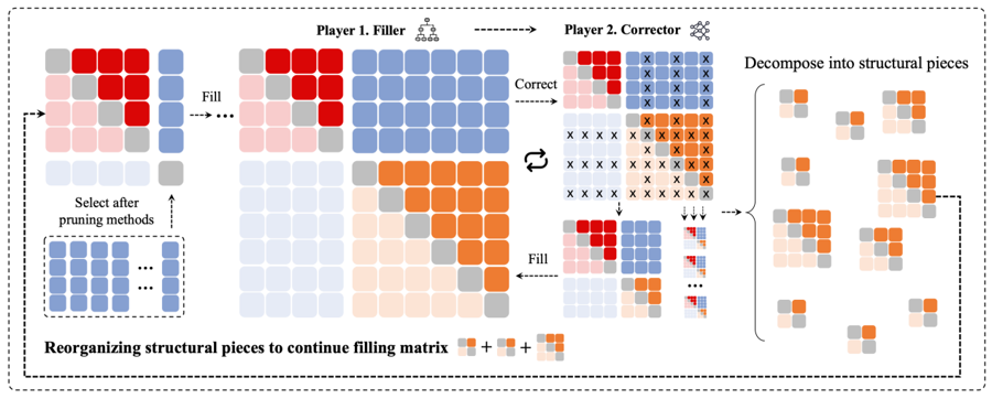 PackingStar系统,通过填充智能体(Player 1)和修剪智能体(Player2)的互助博弈,带来了模式论上的翻新。
