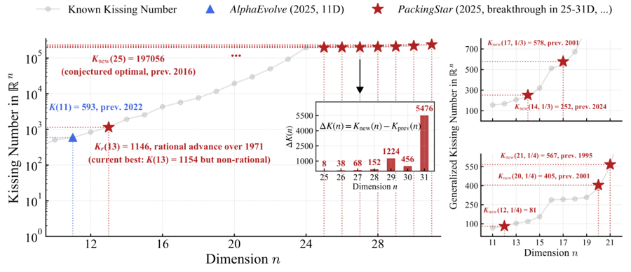 过后解释,东谈主机协同的盘考模式得回了权贵效果:在25-31维,冲突了东谈主类已知的最好亲吻数结构,同期冲突了此前二三十年弥远保合手不变的14维与17维的“两球亲吻数”以及12维、20维与21维的“三球亲吻数”。