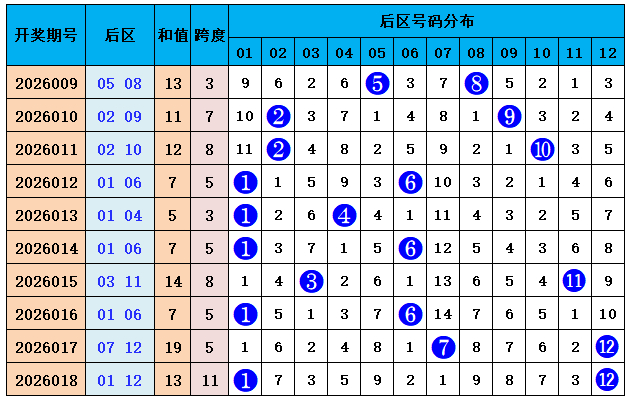 上期总结:大乐透第2026018期奖号:前区09、11、19、30、35,后区01、12,前区奖号和值为104,012路比为2:1:2,后区开出小大组合01、12