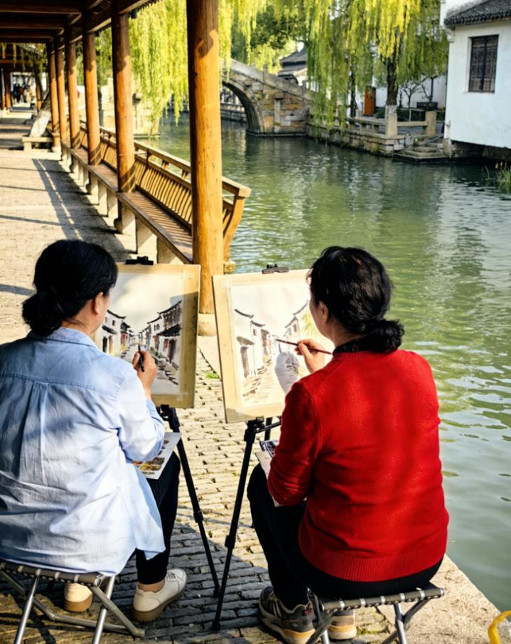 有一次,她们去意境的一个古镇,坐在河滨画廊桥。画到一半,张姐霎时说:"秀芝啊,你知谈我为什么这样心爱画画吗?"