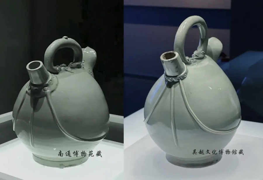 南通博物苑的镇馆之宝中,有一件土产货出土的晚唐五代时刻越窑青瓷皮囊壶。《资治通鉴·后唐纪三》:“长兴二年,吴越王钱元瓘遣使北上,以越窑秘色瓷易契丹宝马三百匹。”五代十国,吴越国将越窑青瓷当硬通货,而这只皮囊壶恰是昔日“外贸定制款”的实证。无特有偶,在杭州临安的吴越文化博物馆,也谨防着一只名堂换取的越窑青瓷皮囊壶,并称传世的两件皮囊壶。