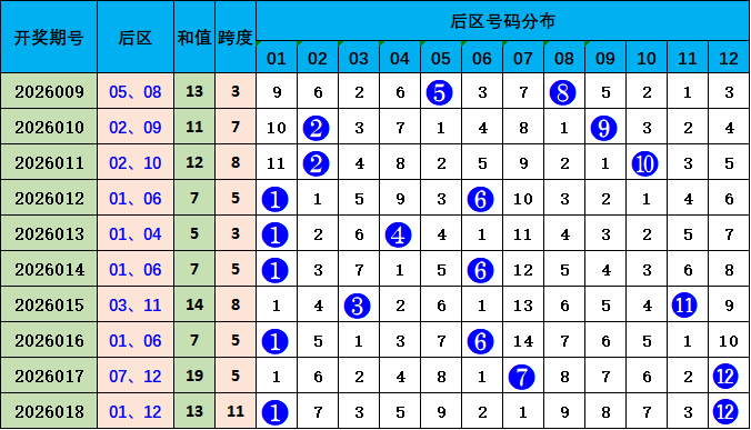 后区走势分析:上期开出01 12,开出和值13,较前一期和值着落6个点位变化,本期接洽和值飞腾,参考号码05 12,和值17。