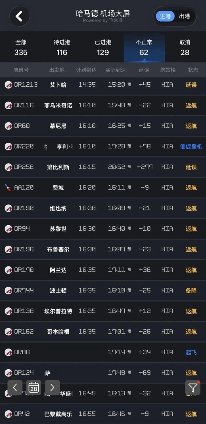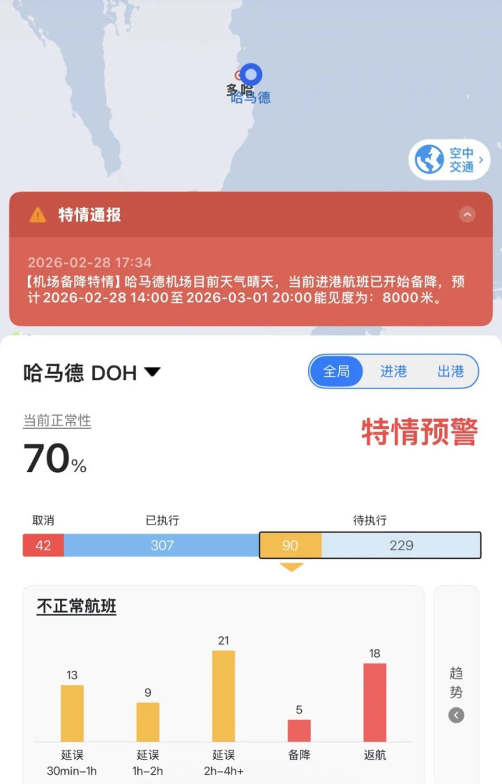 波士顿、多伦多飞多哈的卡航,备降在雅典。亚特兰大、洛杉矶飞多哈的,备降在伊斯坦布尔。