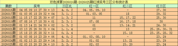 双色球第2026025期奖号为:02 03 15 20 23 24 + 10,红球三区比为2:2:2。