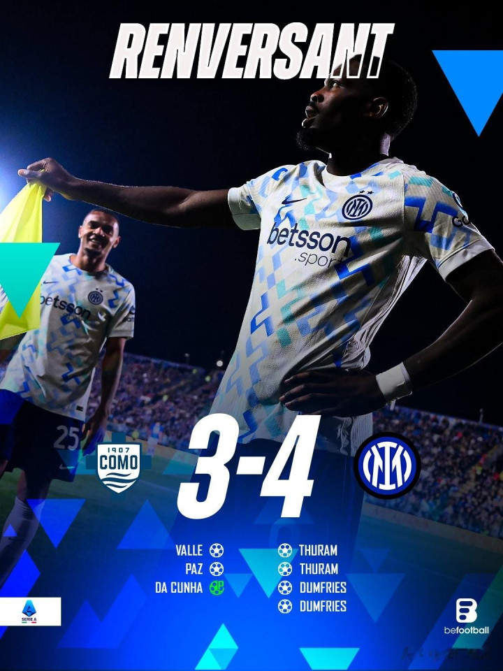 下半场第49分钟,科莫后场出现紧要舛讹,塔图姆的破门令国米不才半场开始就扳平了比分;第58分钟,接到恰尔汗奥卢开出的放肆球后,后点无东谈主盯防的邓弗里斯头球破门,国米完成了从0-2到3-2的逆转!