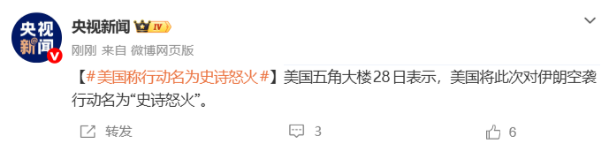好意思国五角大楼28日默示,好意思国将这次对伊朗空袭行动名为“史诗肝火”。