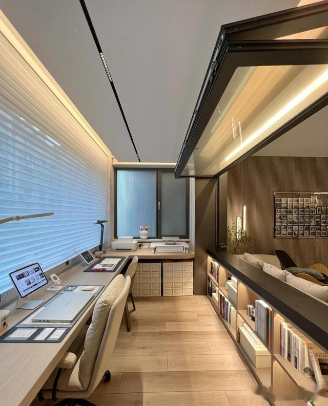 视觉上通透,隔音收尾还特别好,孩子在内部上网课,我在外面追剧,谁也不影响谁,比实体墙还管用呢。悬浮书桌底下还作念了几个薄抽屉,收纳文献贵寓特别便捷。