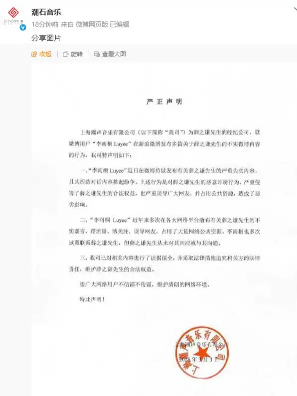 在一派喧嚣中,薛之谦的经纪公司潮石音乐发了声明。