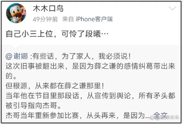 紧接着,张杰的前女友——段曦,一个在05后听起来像上古神兽的名字,倏得诈尸回生,力挺薛之谦“多情有义”,并控诉我方当年被出轨、被离异、被网暴。