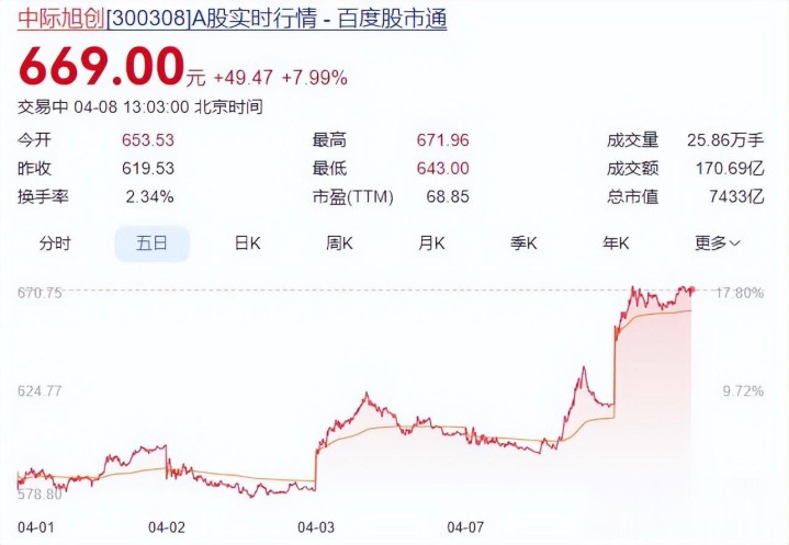 光模块龙头中际旭创,盘中股价一度暴涨杰出8%,创下历史新高。