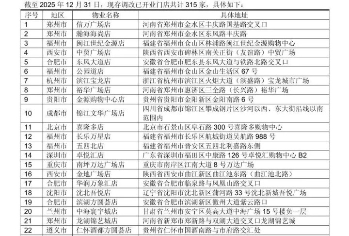 贵州的已开业门店由2024年末的27家减至2025年末的6家,减少了21家,降幅77.78%。